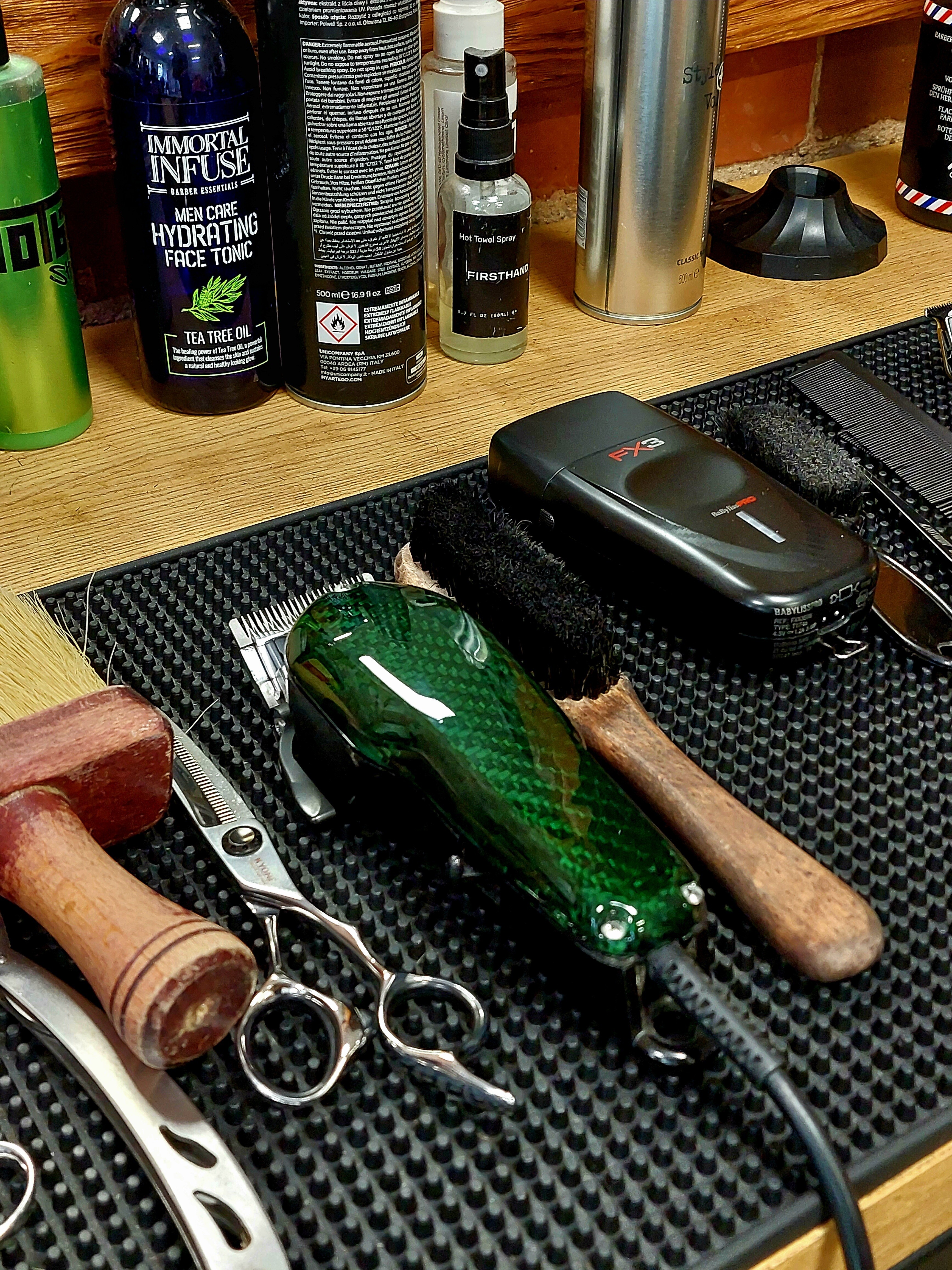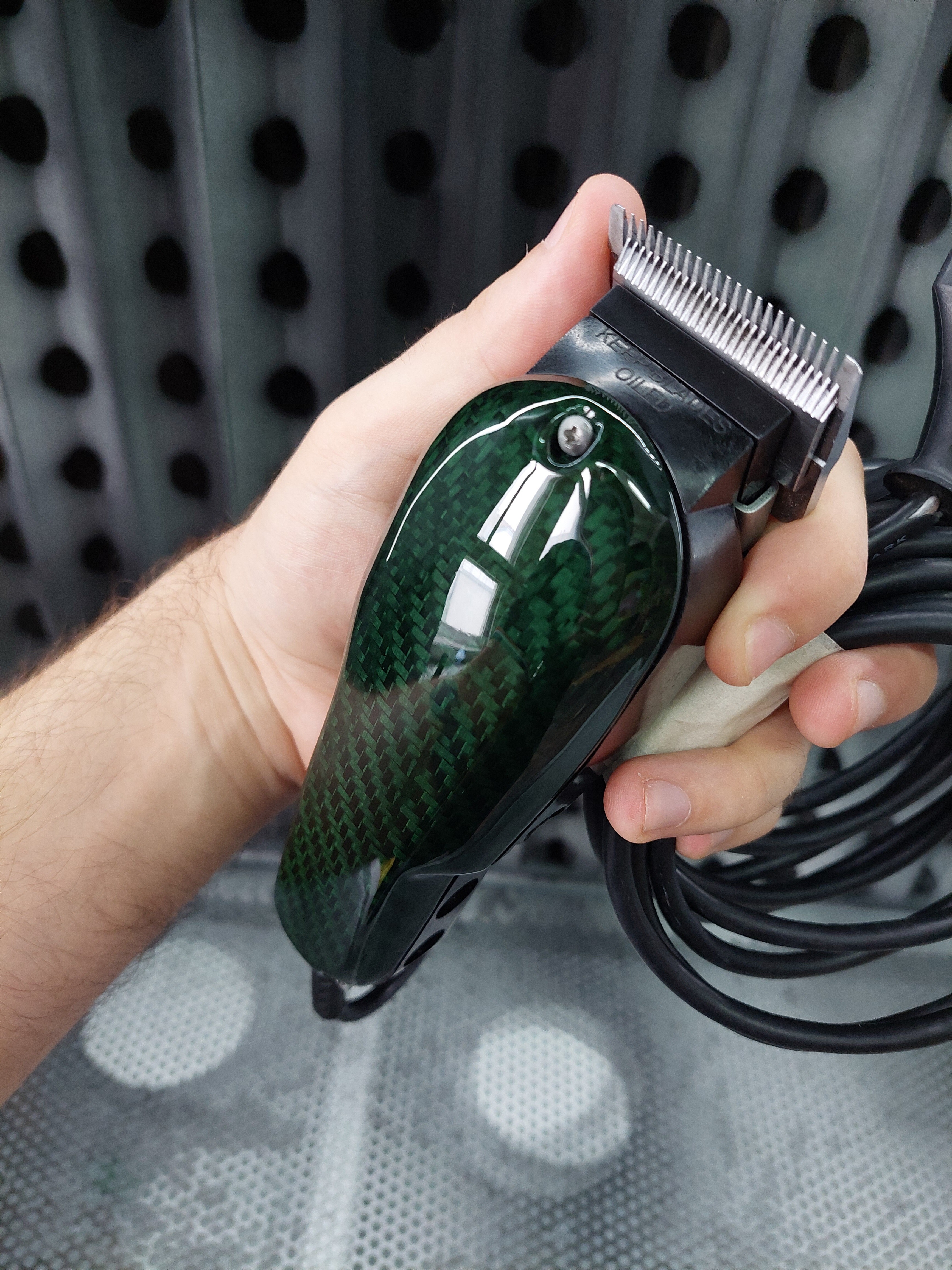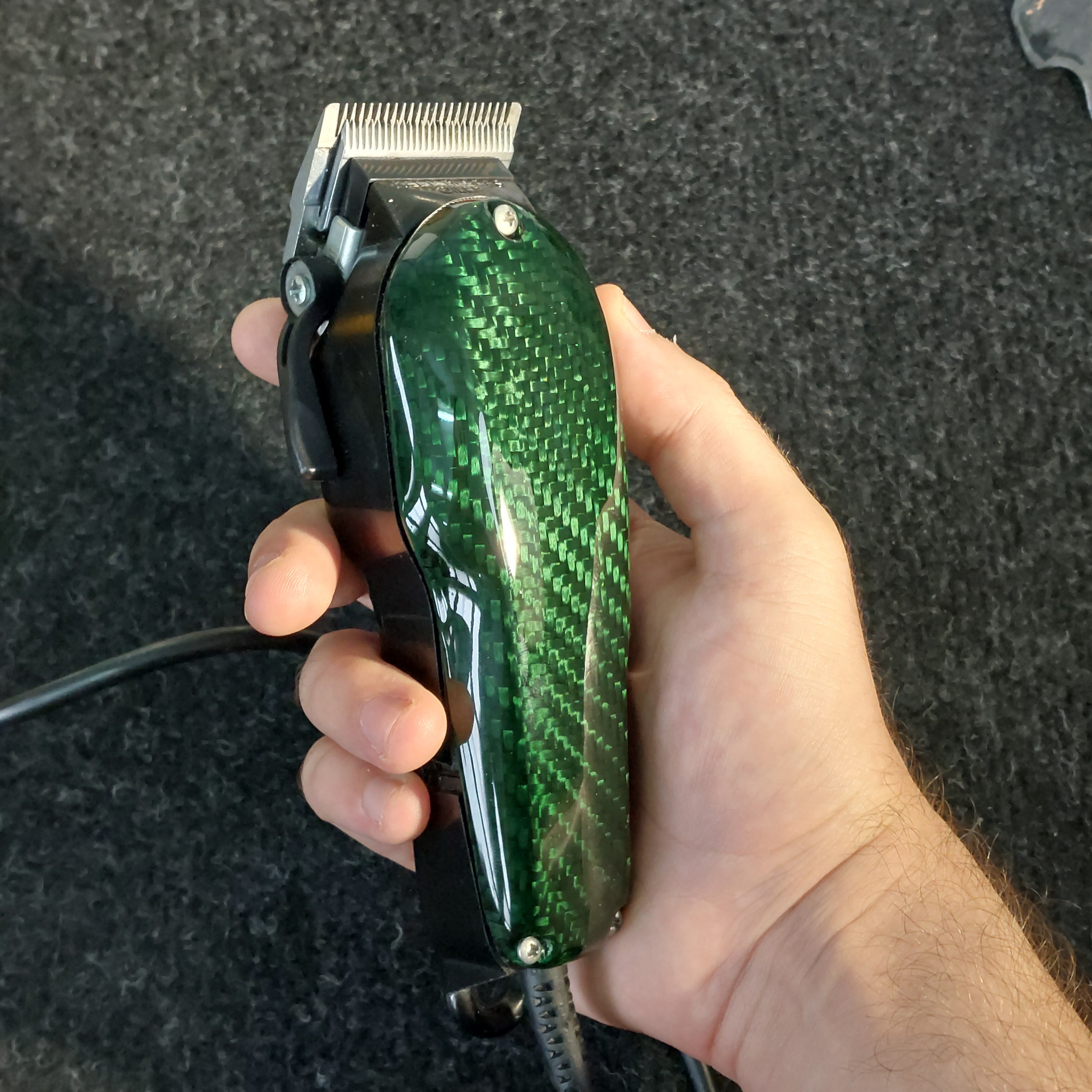 Osłona z Carbonu do maszynki Barberskiej. Oprócz lakieru bezbarwnego została polakierowania również lakierem Candy, który nadal jej zielonkawego zabarwienia.